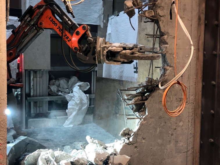 We stripped out and demolished parts of internal walls at offices within 77 King St in the Sydney CBD. Works involved saw cutting and removal of solid concrete to make room for internal windows. Our Husqvarna DXR 140 demolition robot and S70 Bobcat were perfect for the tight access works involved.