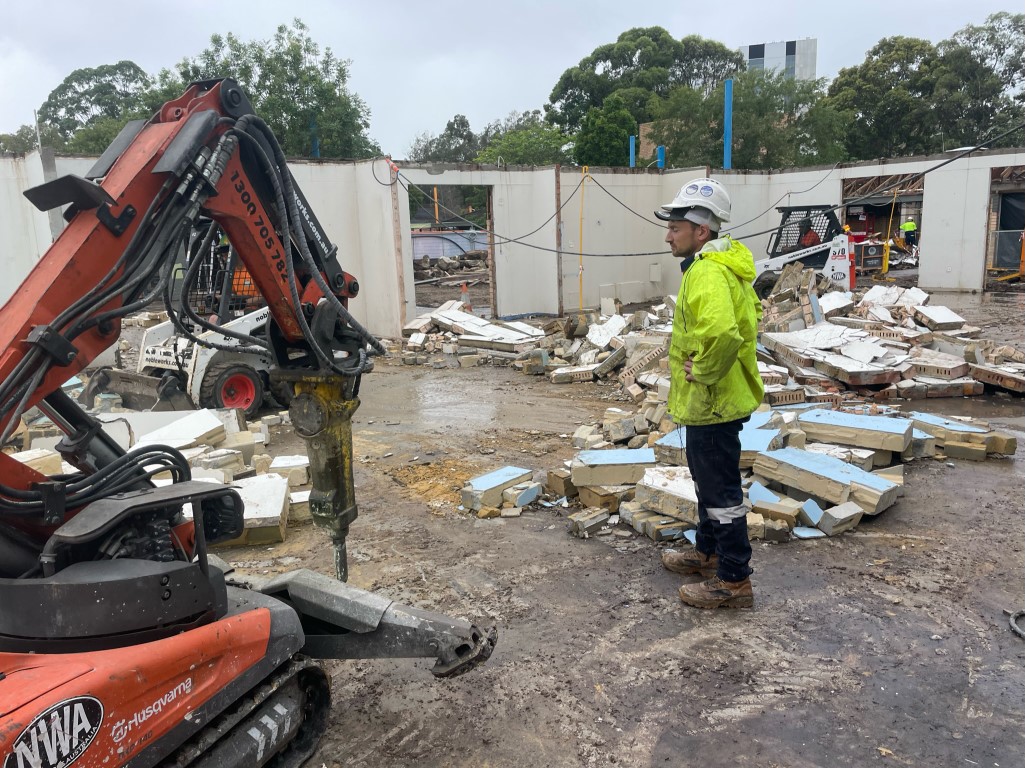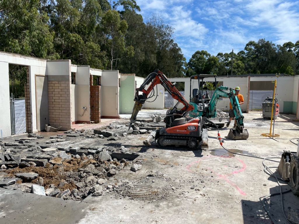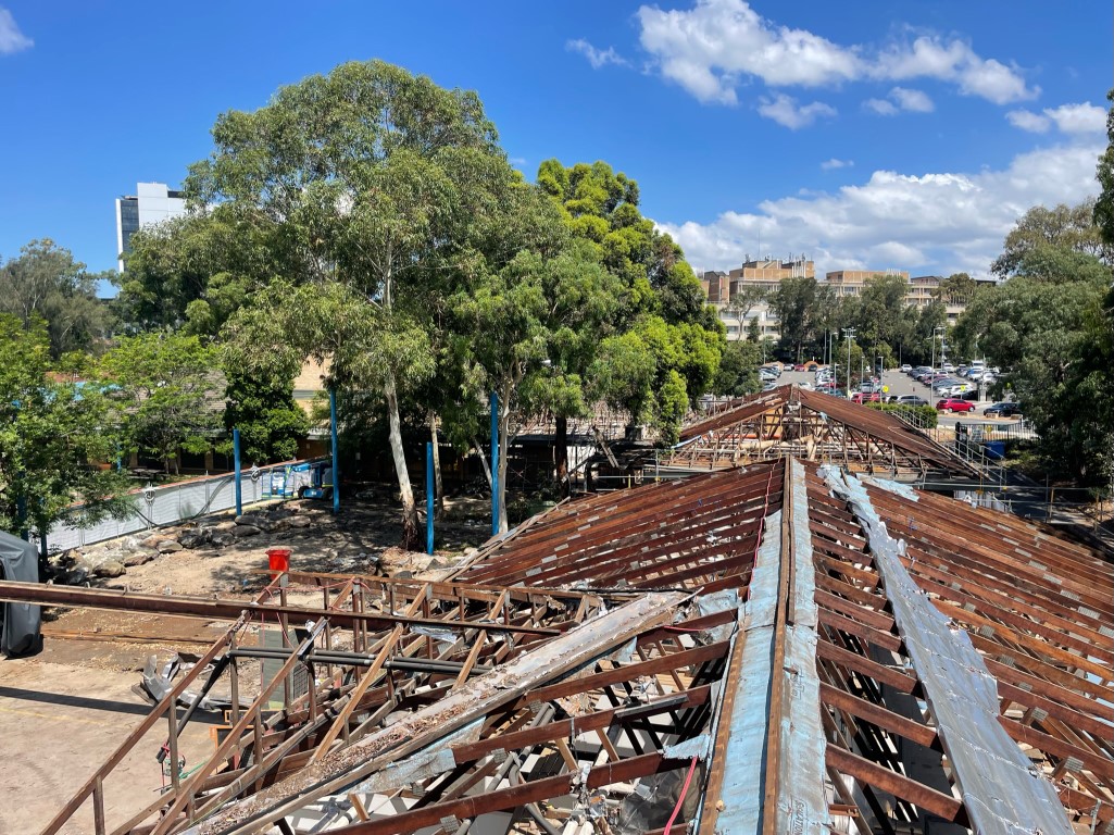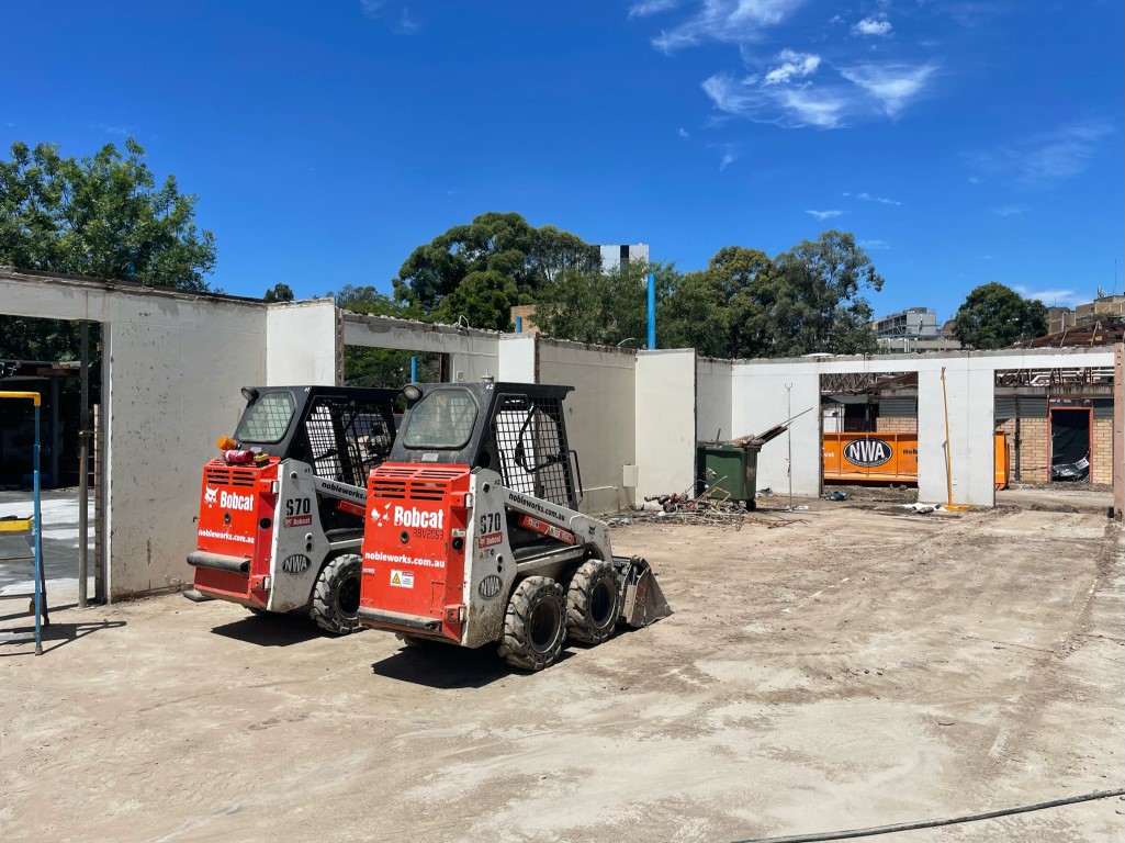 After removing shade sails and a number of trees, the buildings were partially demolished according to plans so some existing walls could remain. This involved reinforcing walls prior and during active demolition.