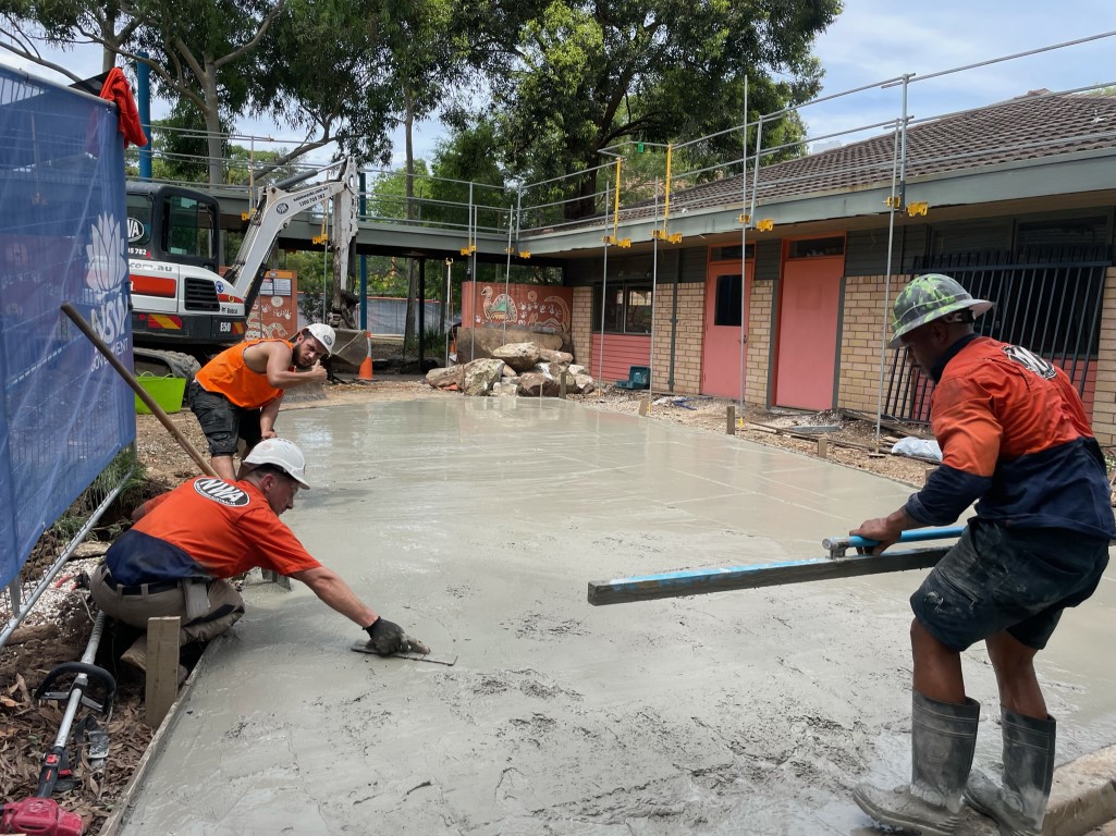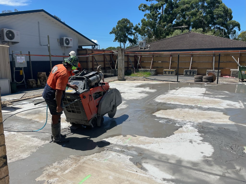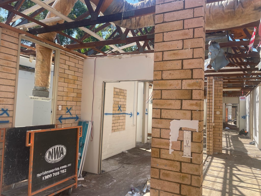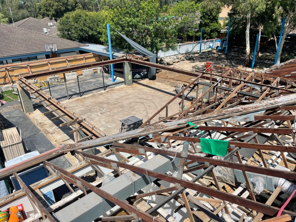 After removing shade sails and a number of trees, the buildings were partially demolished according to plans so some existing walls could remain. This involved reinforcing walls prior and during active demolition.